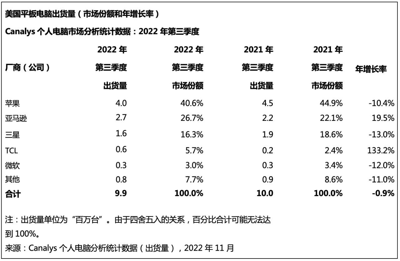 苹果以 41% 的商场份额坚持了其长时间以来在美国平板电脑商场的领先地位。最近几个季度,因为顾客对价格愈加灵敏高端平板电脑遭受波折,而亲民价位段的平板电脑则体现较为超卓。亚马逊商场份额到达 27%,排名第二,在 7 月份成功举行的Prime会员日的支撑下,其出货量增加了 20%。三星以 160 万台出货量位居第三,同比下降 13%。TCL加大了在美国的营销和品牌推行力度,增加势头继续微弱,涨幅高达 133%,而微软以 12% 的跌幅跻身前五名。