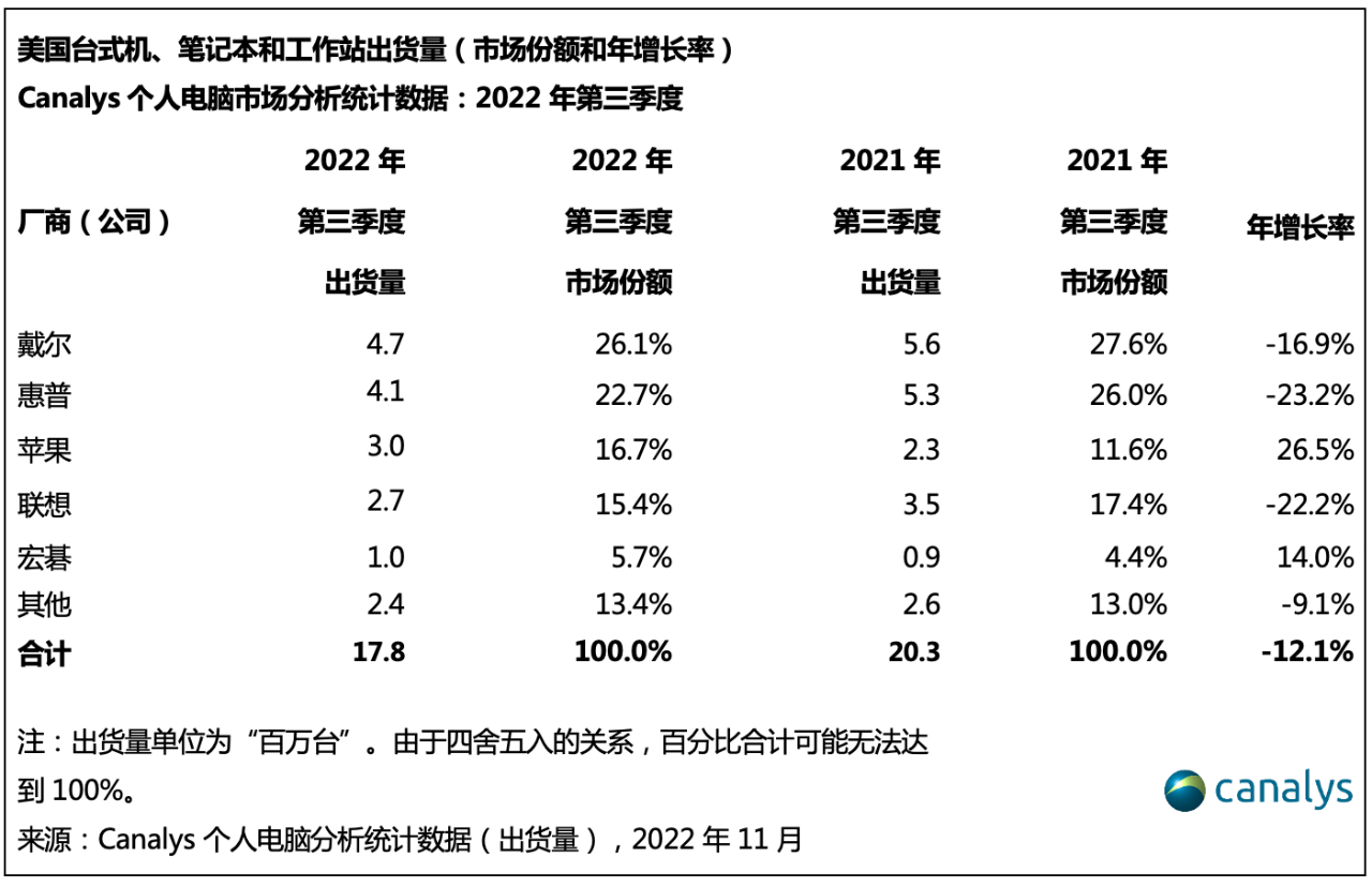 戴尔在第三季度以 26% 的商场份额稳居美国台式机和笔记本电脑商场首位,但其出货量同比下降了 17%。惠普的出货量为 410 万台,位居第二,但在前五大厂商中跌幅最大,出货量下降了 23%。得益于第二季度供给严重的积压订单开端连续出货以及新推出的 M2 电脑,苹果在第三季度体现杰出,出货量增加了 26%。联想在商用商场寸步难行,出货不抱负,跌至第四位。宏碁以 14% 的微弱增加位居第五。
