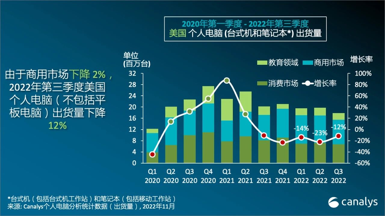 Lynch弥补道:“展望未来,美国个人电脑商场将面对进一步的增加窘境。虽然第四季度是节日季,但商场仍将继续的低迷。资金严重的顾客将减少对贵重科技产品的开销。近几个月来,零售商加大了促销力度,以便在假期季行将到来之际,为新设备的发布做衬托。但整体上零售库存的增加速度仍快于产品的出售速度。教育商场将在 2023 年开端缓慢复苏,但现在看来,或许会在 2024 年才迎来大规模的设备更新。教育经费依然坚持健康发展,但估计学校会需求标准更好的专用设备,这些设备的价格往往也更高。归纳考虑以上这些要素,咱们估计 2023 年上半年美国个人电脑出货量会进一步下降。”