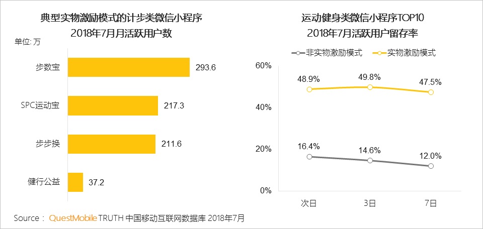QuestMobile 数据显现,以步数宝、SPC 运动宝等为代表的什物鼓舞形式的计步类微信小程序,用户规划增加敏捷,月活泼用户数达百万级。从活泼用户留存率来看,什物鼓舞形式体现较优。
