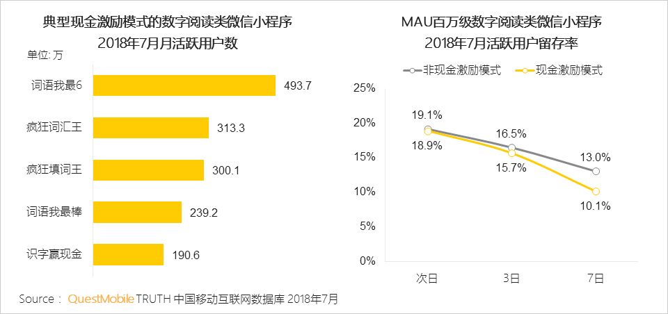 依据 QuestMobile 数据,2018 年 7 月月活泼用户数在百万以上的数字阅览职业微信小程序共有 34 个,近一半都归于利益驱动用户增加形式,其间现金鼓舞形式的有 12 个,以词语我最 6、张狂词汇王为代表的小程序月活泼用户数均在百万以上。
