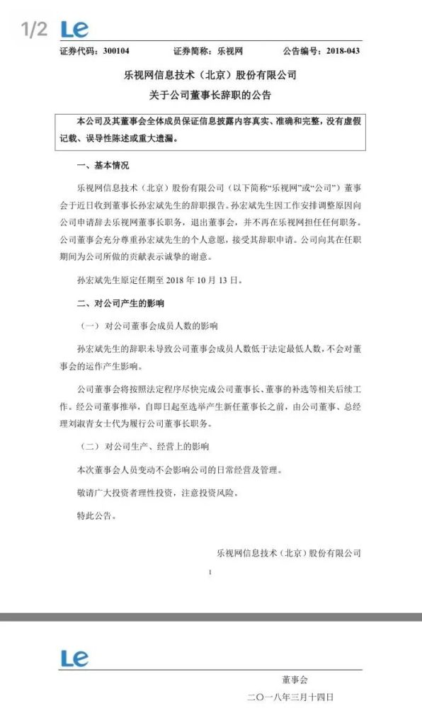 乐视网信息技术(北京)股份有限公司发布公告称,董事会已经在近期收到董事长孙宏斌先生的辞去职务报告。公告中,乐视网董事会表明,孙宏斌因作业组织调整,向原公司请求辞去乐视网董事长职务,退出董事会,不再担任乐视网任何职务。