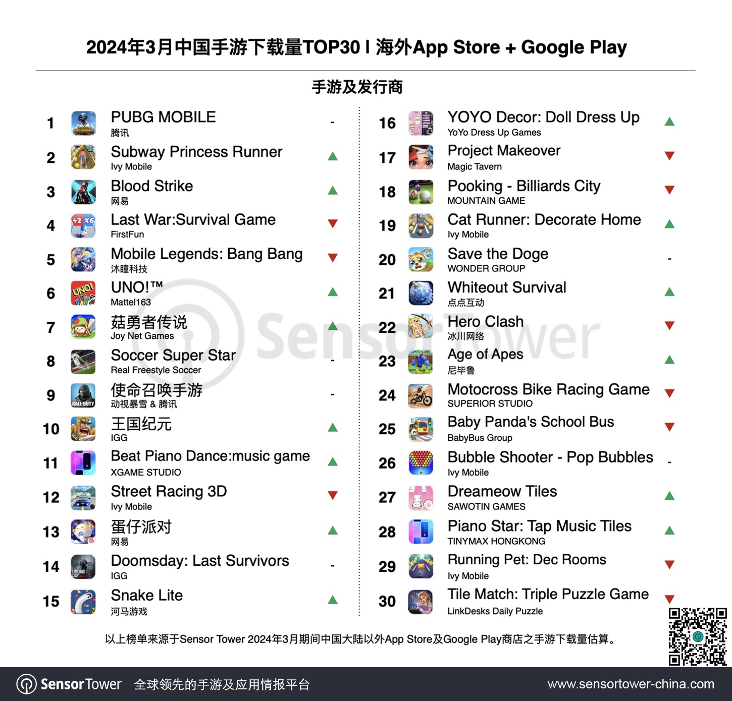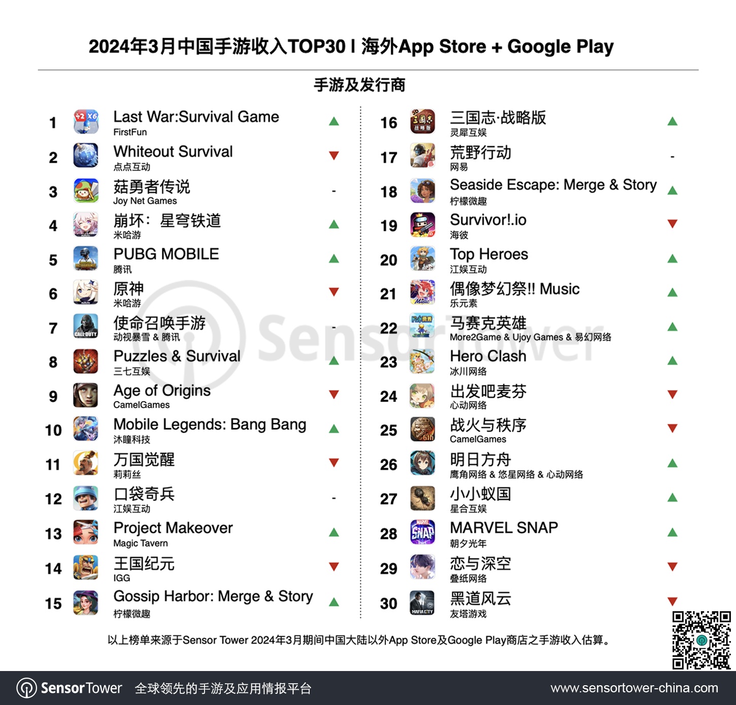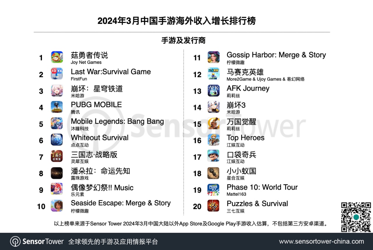3月中旬,沐瞳科技MOBA手游《Mobile Legends: Bang Bang》敞开年度庆典“MLBB ALLSTAR 2024”,并推出“March StarLight”、“The Aspirants Skins”等活动,全新人物和皮肤的上线推进该游戏3月海外收入环比上升38%,位列增加榜第5名。