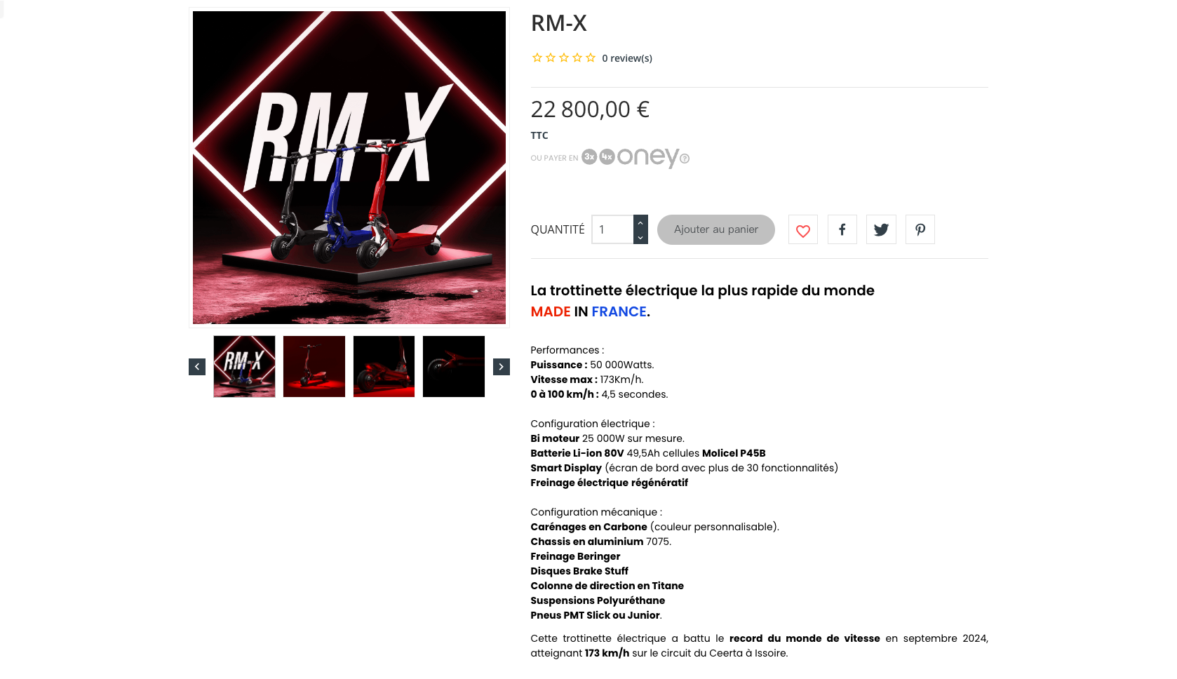 的电动滑板车包括两个25000W的电机(合计50000W的输出功率),总质量55KG。Rage Mechanics表明,这是国际上最快的电动滑板车(于24年9月打破了相应的国际速度纪录),并特别强调这是“法国制作(MADE IN FRANCE)”。续航方面,RM-X采用了80V/49.5Ah标准的锂电池,电芯为Molicel P45B。不过,RM-X并未标示其续航路程(尽管这个数据对它来说也不是那么重要)。